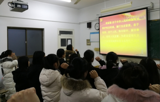 本网讯 12月10日下午,2138CC太阳集团第八党支部博约楼408教室开展学宪法主题党日活动。第八党支部学生党员、入党积极分子参与了本次活动,活动由支部书记周贵勤老师主持。首先,周老师对《中华人民共和国宪法》进行了领学,就宪法的目的、实质、作用等进行解读,进一步凝聚了党员带头尊法学法守法用法的共识,要求全体党员同学把学习宣传领会党的十九大精神作为一项重要的政治内容学习,把党的十九大精神学好、学实。接着,全体党员同学在党员王南云的带领下进行了庄严的守法宣誓。
